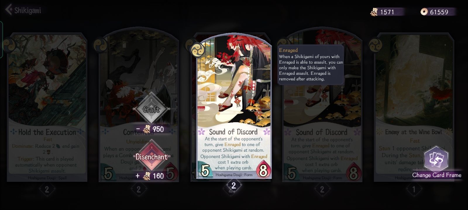เมื่อเริ่มเทิร์นของฝ่ายตรงข้าม เราจะมอบ Enraged ให้ชิกิงามิ 1 คนแบบสุ่ม คนที่โดนเอฟเฟกต์นี้จะทำให้โดนจ่ายลูกไฟแบบพิเศษ 1 ลูกเมื่อมีการเล่นการ์ด