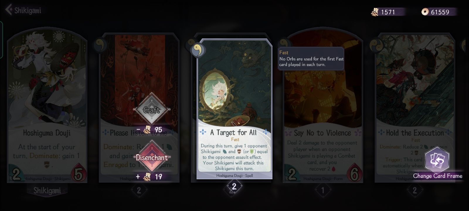 Fast ในระหว่างเทิร์นนั้นจะเพิ่มพลังโจมตีและเกราะแตกหรือโล่ให้กับชิกิงามิฝ่ายตรงข้าม ตามการโจมตีในขณะนั้น และถ้าชิกิงามิเราโจมตีจะเล่นการ์ดนี้เลยทันที